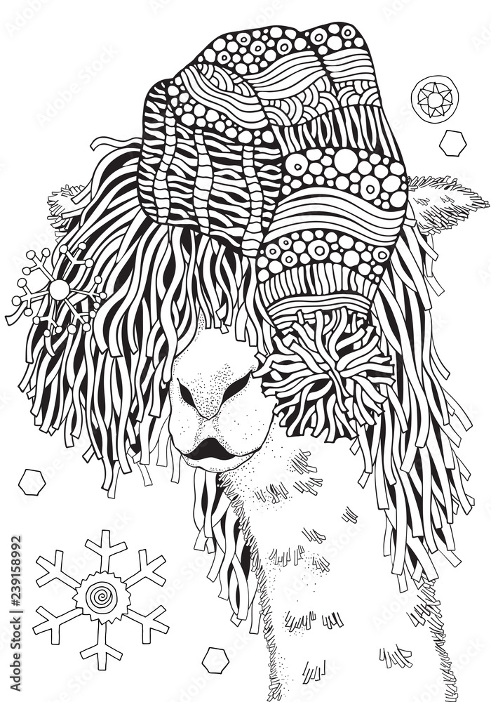 Winter Llama Coloring Book Page For Adult And Children In Doodle Style Black And White Background Hand Drawn Christmas Lama Stock Vector Adobe Stock